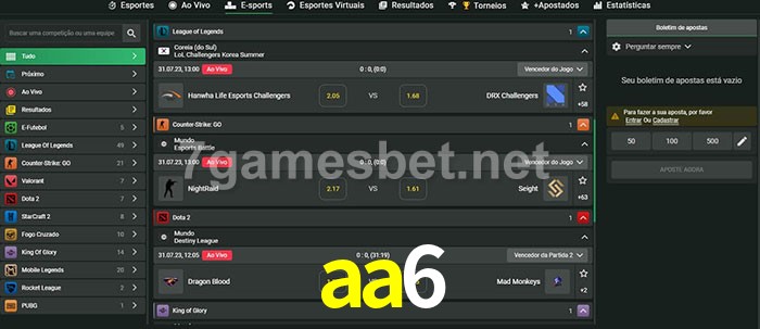 O aa6 oferece uma grande seleção de opções de apostas em e-sports com probabilidades competitivas